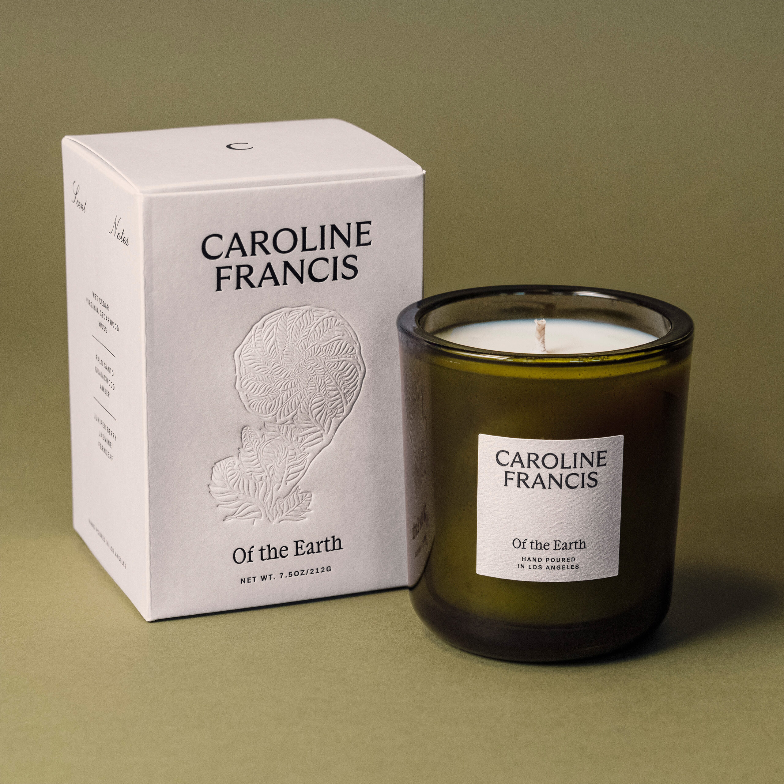 Caroline Francis Of The Earth Candle is made of 100% paraffin-free coconut soy wax using ingredients that are non-toxic and sourced from ethical partners. Each candle is hand-poured in Los Angeles, California. The candle vessels are made with recyclable glass and the wick is made of 100% natural fibers.